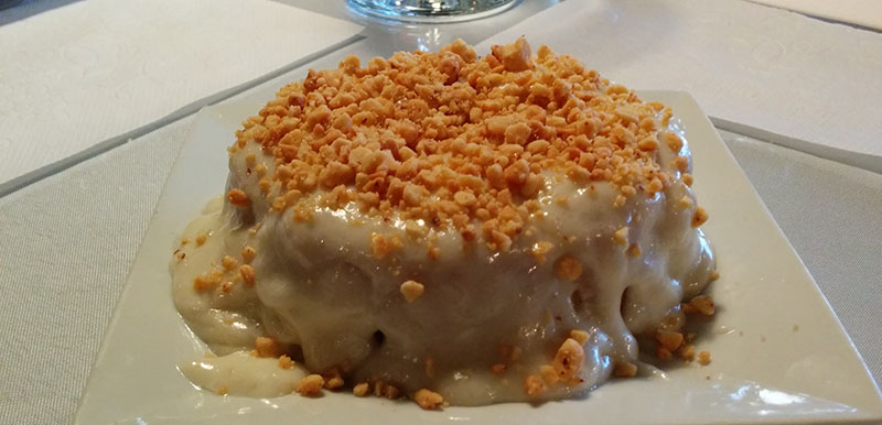 Vietnamese rice noodles dressed with coconut milk, fried crispy tofu and topped with crushed peanuts.