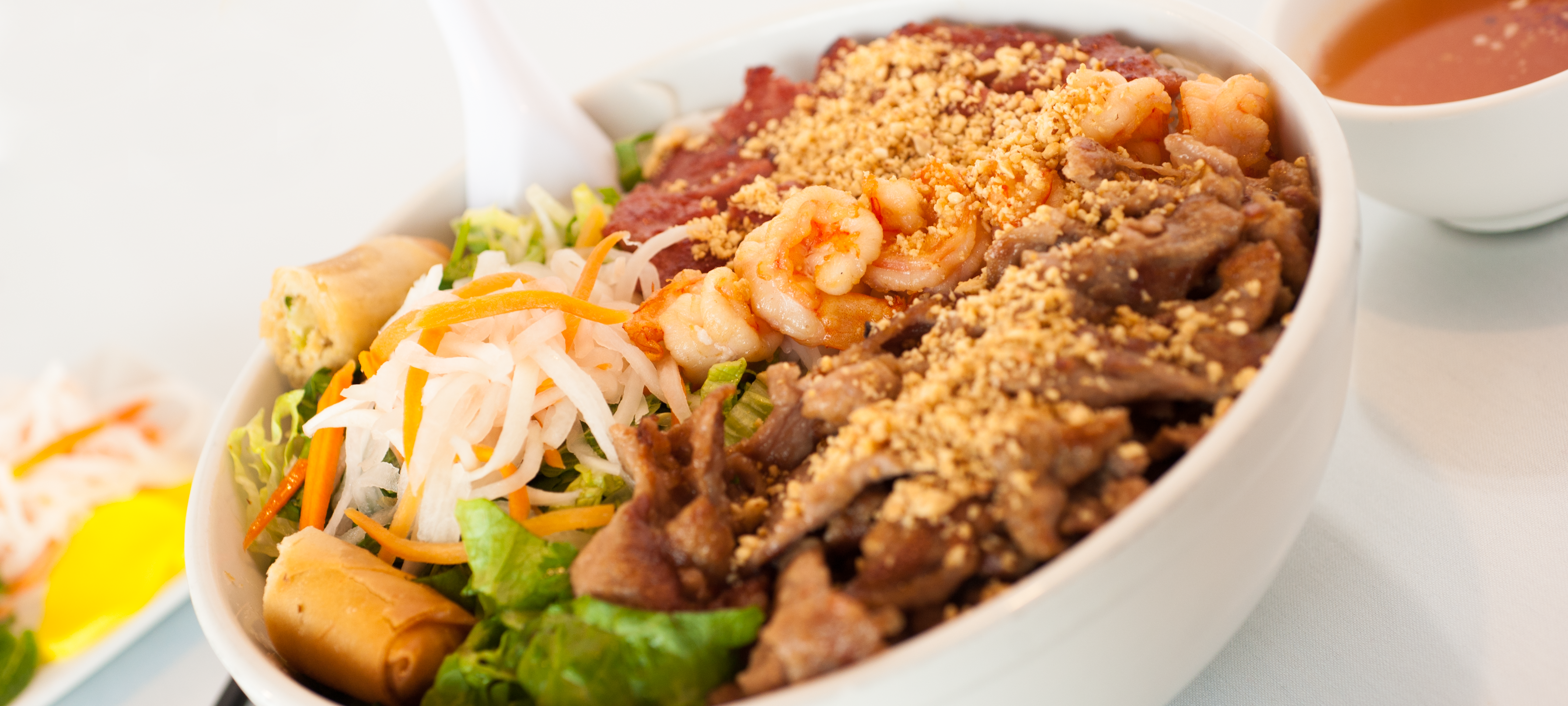 Mix of lotus roots, carrots, pickled carrots and white radish, shrimp, pork, and fresh basil topped with crushed peanuts.