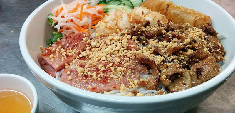 Grilled Pork Patties, lettuce, cilantro, pickled carrots, mint, white radish and basil wrapped in rice paper. Served with homemade sauce.