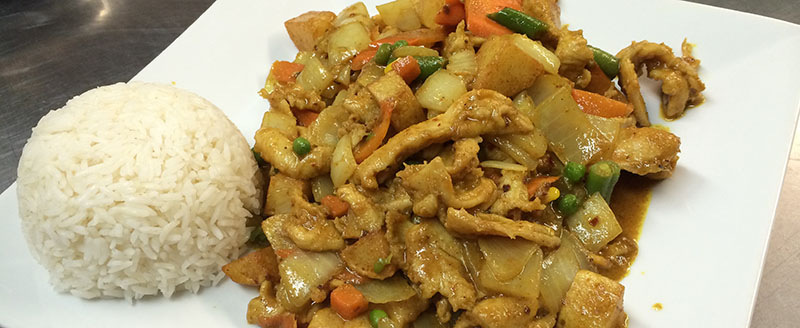 Choice of chicken, pork, beef or shrimp mixed with potatoes, onions, green peas, and carrots in our homemade curry sauce with coconut milk. Comes with white rice. Beef add 2.00 and shrimp add 3.00 extra.