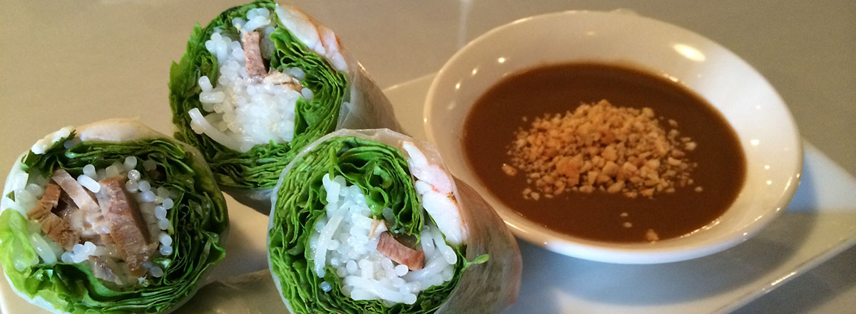 Tofu, Vietnamese rice noodles, lettuce, mint, and cilantro wrapped in rice paper. Served with peanuts sauce.